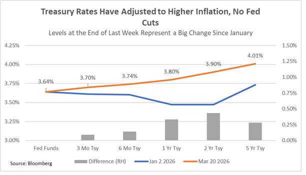 Here’s the Treasury yield curve (five years and in) at the end of last week. There is a big change from the beginning of the year, reflecting renewed concerns about inflation and uncertainty arising because of the Iran War. In a way the two forces are self-reinforcing: higher oil prices and supply chain disruptions push prices higher while an uncertain outlook for prices can alter consumer spending patterns.