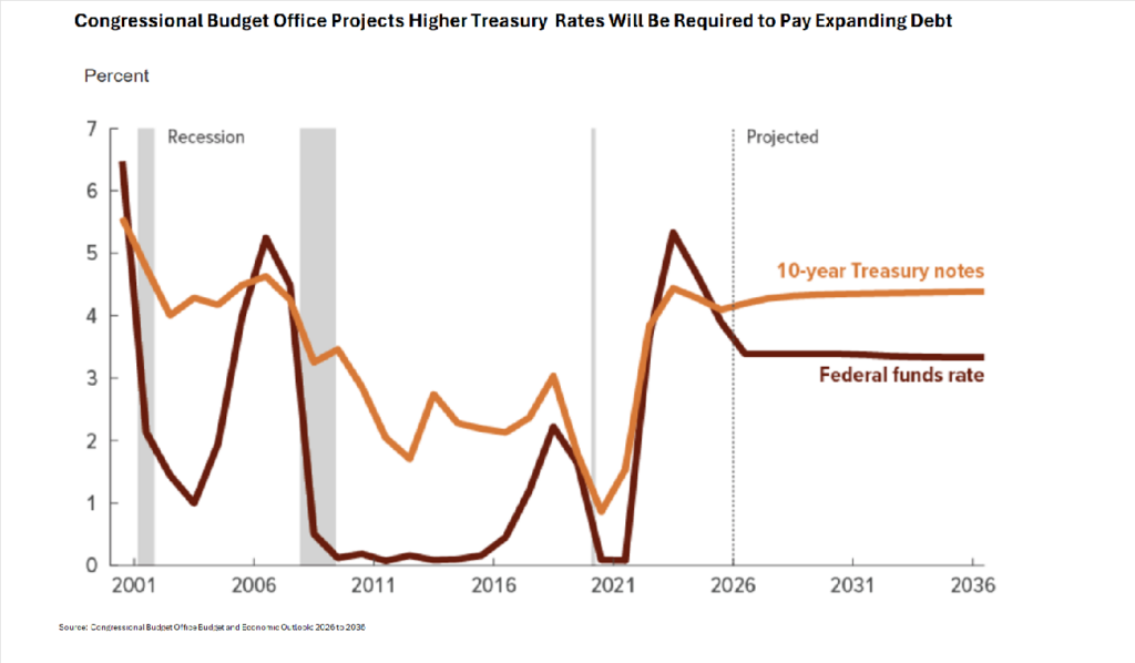 The above chart that accompanied the CBO’s February report forecasts federal funds at three percent and 10-year Treasury rates above four percent over this ten-year period. Doable but at high interest rates.