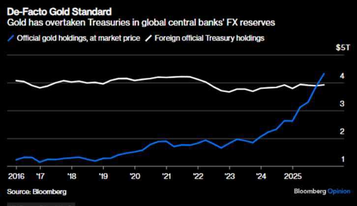 At this writing gold is at a record high vs. the US dollar, about $5,300 per ounce. That’s roughly 80% higher than it was a year ago. Gold in Euros is up about 55% in the period. The difference is in part because the dollar LOST about 12% of its value vs. the Euro in this time. Another big factor, though, is that investors perceive risk and volatility of the dollar to be greater than they do in the Euro. So, the value of the gold “hedge” has appreciated vs. the dollar. That might not comport with the Trump administration’s report card on the U.S. economy, but it expresses the view of global investors, including sovereigns.