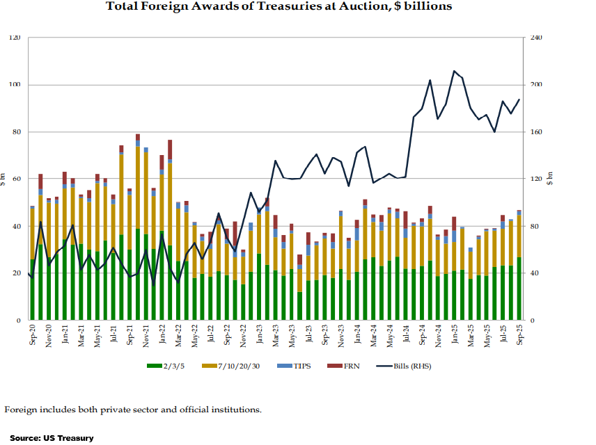 In the short term, foreign investors could also shorten the duration of their Treasury holdings, by buying Treasury bills instead of notes and bonds. This already is under way. As the budget deficit and Treasury funding needs have grown in the past five years foreign accounts have shown a preference for Treasury bills, with awards growing from around $20 billion a month in the immediate post-covid market to $150-$200 billion recently.