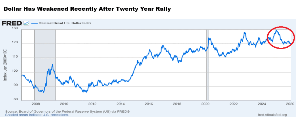 The path peaked in December 2024. Since then, the dollar has lost about eight percent of its value. It’s not a big move when compared with moves after the Great Recession and Covid pandemic, but the move is notable because it took place as the economy posted strong growth compared to growth in other developed economies, long term government bond rates were elevated and the Trump administration touted tremendous commitments by foreign investors. All of these should result in a strong dollar. Yet the market said otherwise.