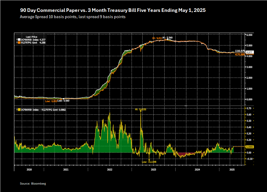 - Commercial paper rates are tracking closely to rates on comparable-maturity Treasuries. The chart below shows the history over the past five years. On average three-month commercial paper has yielded about 10 basis points more than comparable-maturity Treasuries. At this writing, the difference is nine basis points.