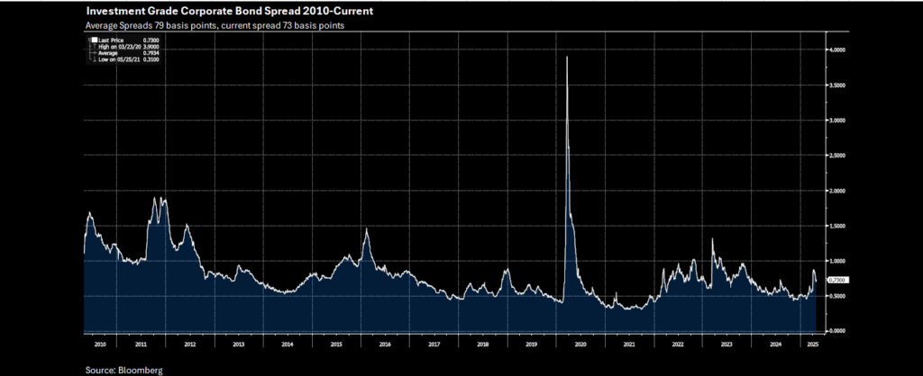 - Corporate bond spreads reflect a similar “what me worry?” view. If you look back at the spreads over the past 15 years, beginning in 2010 when the economy had recovered from the Great Recession, they have averaged 82 basis points. They are now 71 basis points.